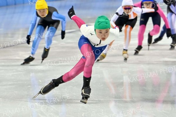 • 【5年女子500メートル決勝2組】ゴール直前で先行する選手を抜き、逆転での優勝を決めた鈴木咲希(下士幌)