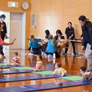 赤ちゃんたちが「わくわくハイハイレース」 家族の声援を浴びてゴール 24組参加