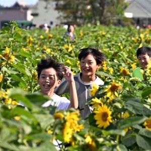 更別農高に今年もひまわり迷路 児童が元気よく駆け回る