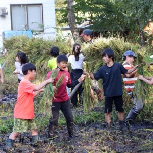新得小5年生が稲刈りに汗 「早くおいしいご飯で食べたい」
