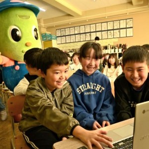 • 画面の向こうの徳島市の児童に十勝の自然を紹介する開成小児童